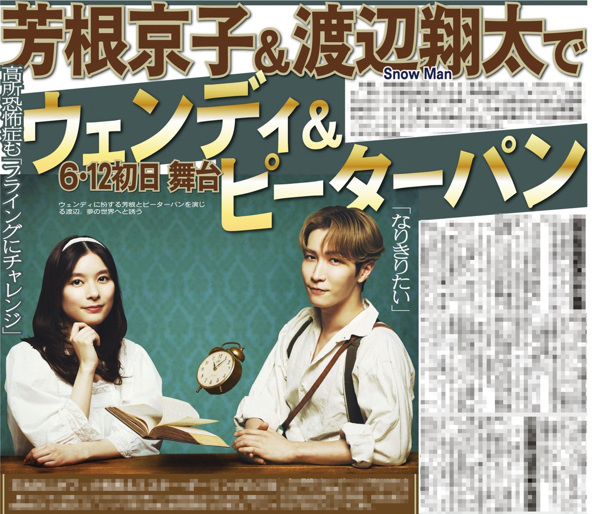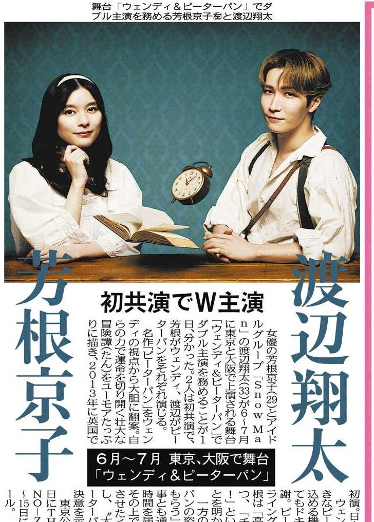 | 渡辺翔太がピーターパンに! 芳根京子とW主演で名作戯曲を翻案、26年6月より日本再演 …2026年6月に東京、7月に大阪で上演 俳優の芳根京子とSnow Manの渡辺翔太が、6月から上演される舞台『ウェンディ&ピーターパン』でダブル主演… (出典:ENCOUNT) |