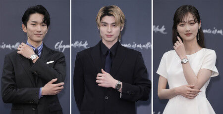 | 「ロンジン アーカイブ展」開催 スイスの時計メーカー・ロンジンが開催した展覧会「ロンジン アーカイブ展~時を紡ぐウォッチメイキングの軌跡~」の発表記念イベントに登壇した(左から)坂井瑠星さん、本田響矢さん、山下美月さん=2日、都内 (出典:時事通信) |